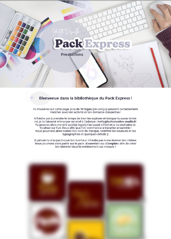 Afin de protéger mes créations, nous signerons en amont un contrat pour cette prestation. Une fois ce contrat signé, tu pourras alors accéder à ma bibliothèque et sélectionner un ou plusieurs logos qui t’auraient tapé à l’œil. Cette offre est non engageante, tu pourras tout à fait te rétracter si tu ne trouves pas ton bonheur dans cette bibliothèque et que tu souhaites plutôt opter pour une prestation 100% sur mesure avec le Pack Essentiel ou bien le Pack Complet. Contacte moi juste ici